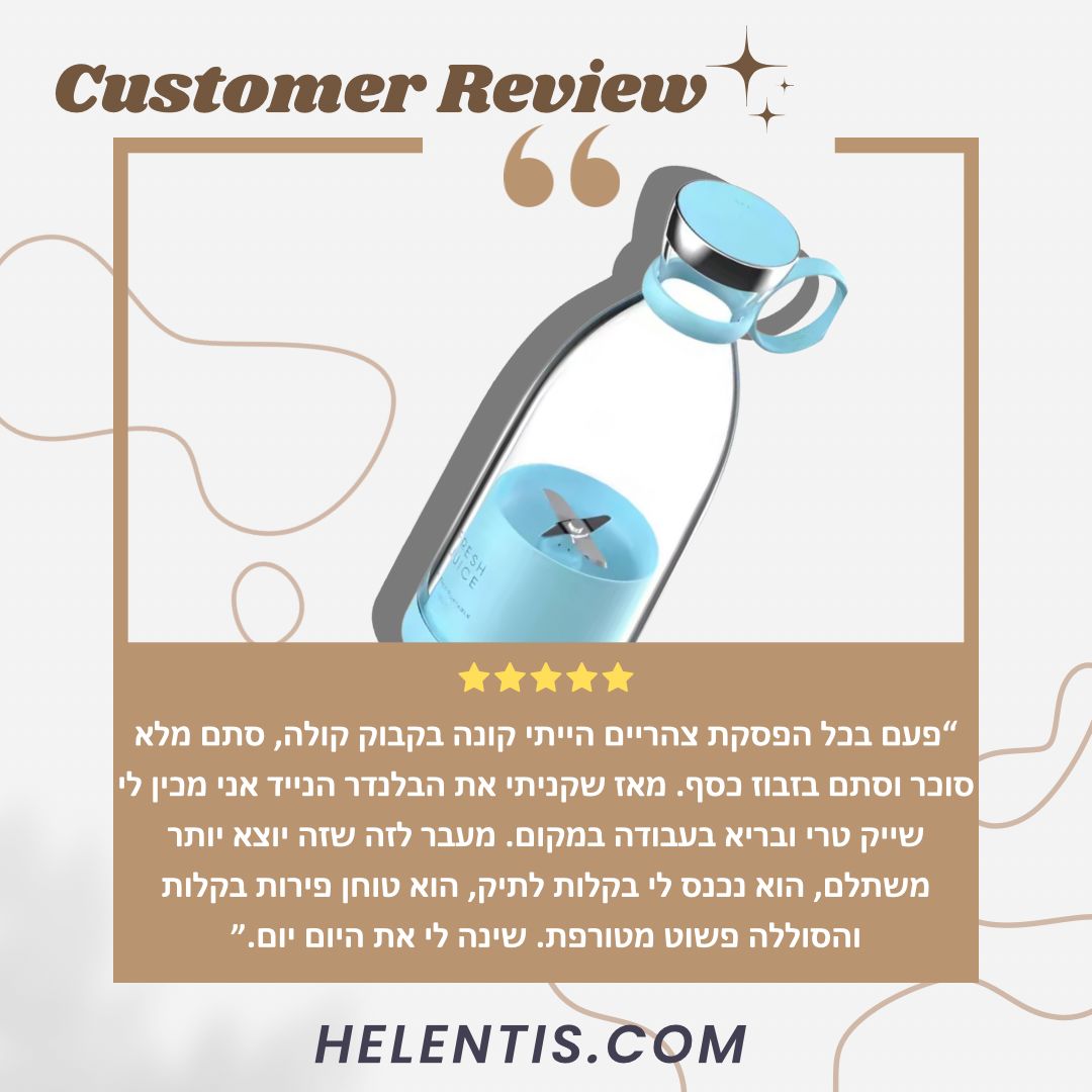 "לא האמנתי שהמוצר הזה ישנה לי ככה את השגרה, אבל הפסקתי לקנות משקאות ממותקים כמעט לגמרי. כל בוקר אני לוקחת אותו איתי לעבודה ומכינה שייק בהפסקה שלי. הפיה נוחה מאוד. וזה שאפשר לשתות ישירות ממנו חוסך לי לחפש כוסות או להיסחב עם בקבוקים ונותן לי בוסט של אנרגיה."